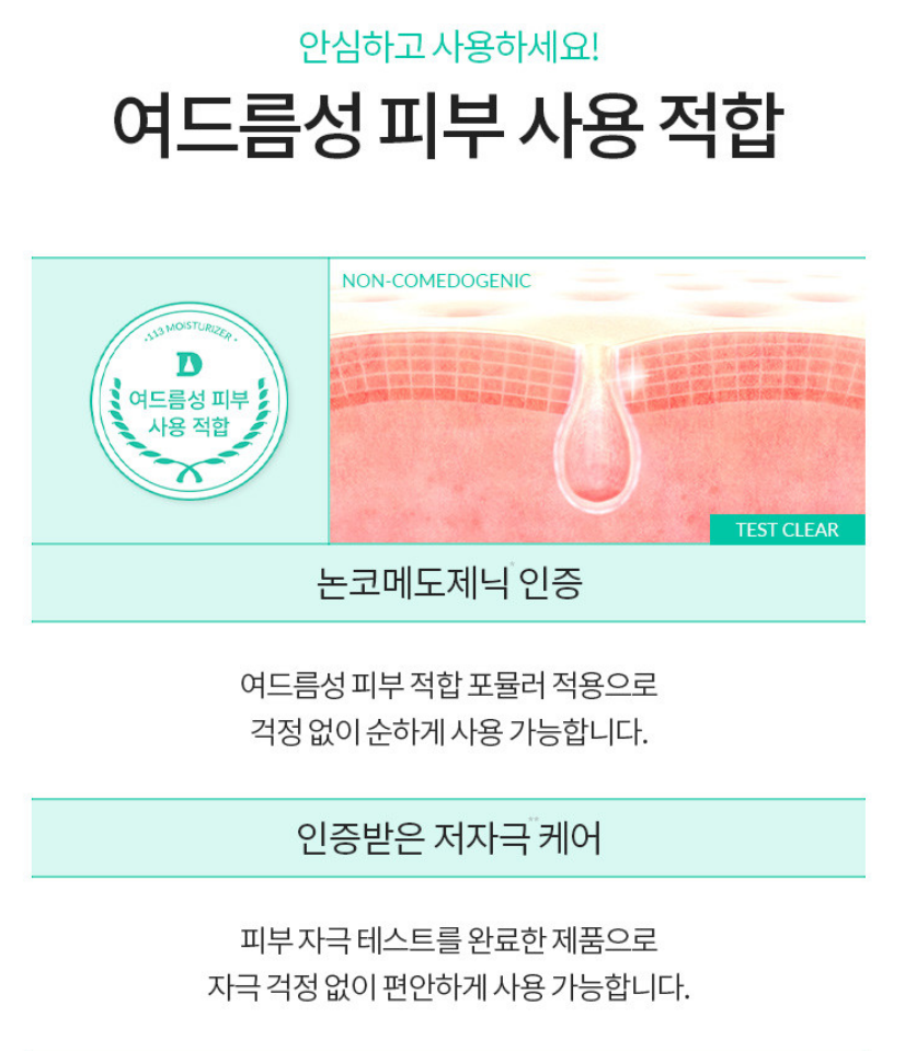 113 모이스트라이저 역시 불필요한 향료나 색소를 배제하고, 피부과 테스트를 완료한 더마 제품입니다.