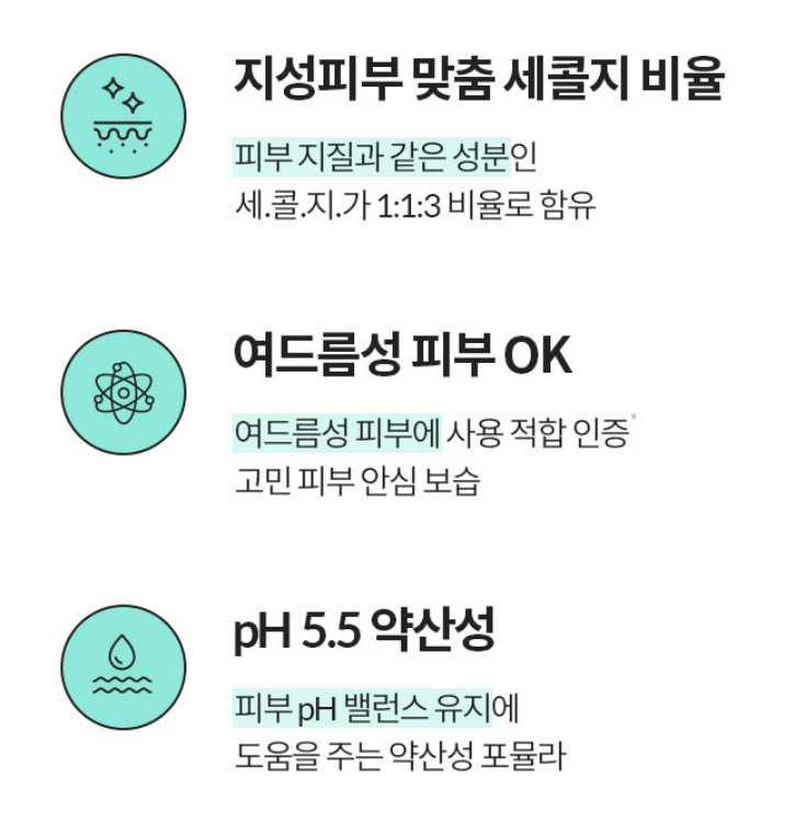 피부 지질 구조와 동일한 1:1:3 비율의 보습 성분, 약산성 포뮬러, 그리고 피지 조절 기능까지