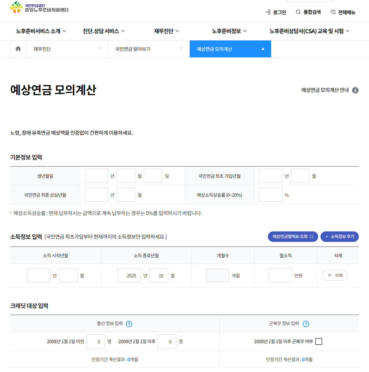 ‘예상연금 간단계산’ 클릭 후 정보 입력