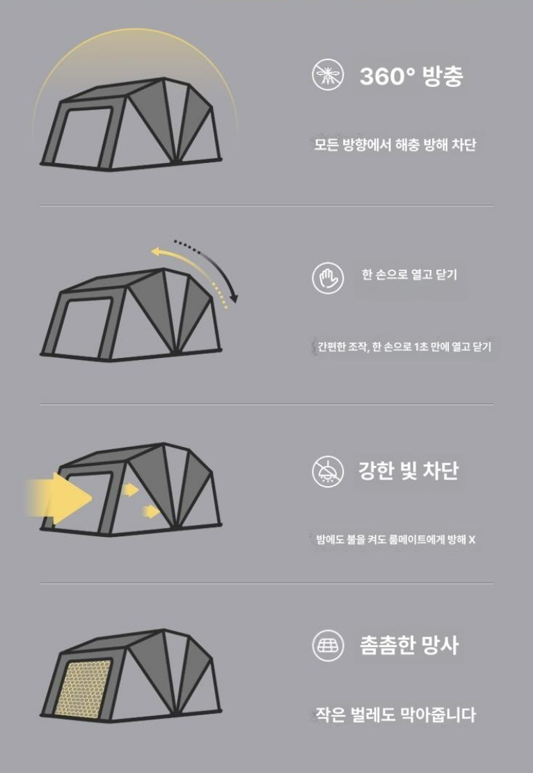 ✔ 아침 햇살 때문에 매번 깨곤 했는데, 이 텐트 덕분에 숙면합니다.