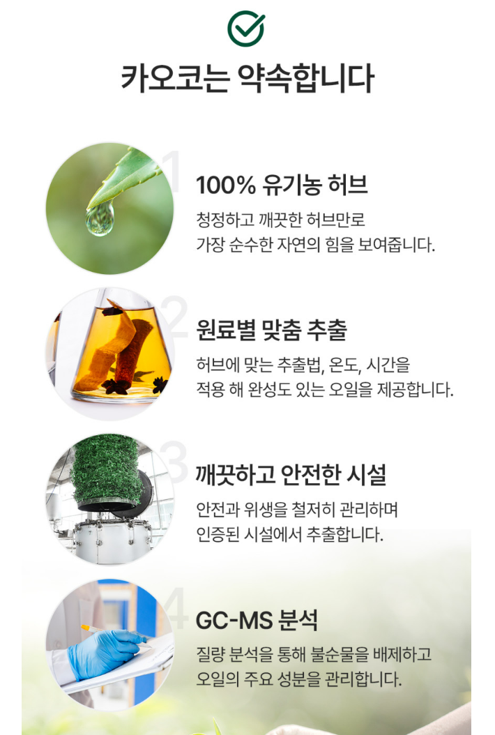 하지만 카오코 오일은 GC-MS 분석을 통해 성분 비율을 관리하며, 100% 허브 원액만을 사용합니다.