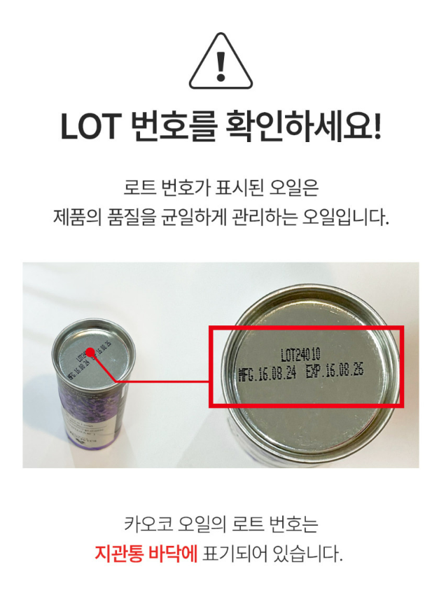 → 카오코 오일은 지관통 바닥에 LOT 번호가 인쇄되어 있습니다.