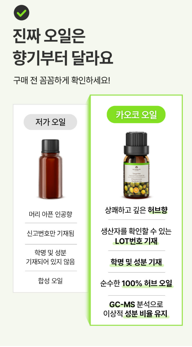 | 구분 | 저가 오일 | 카오코 에센셜 오일 |