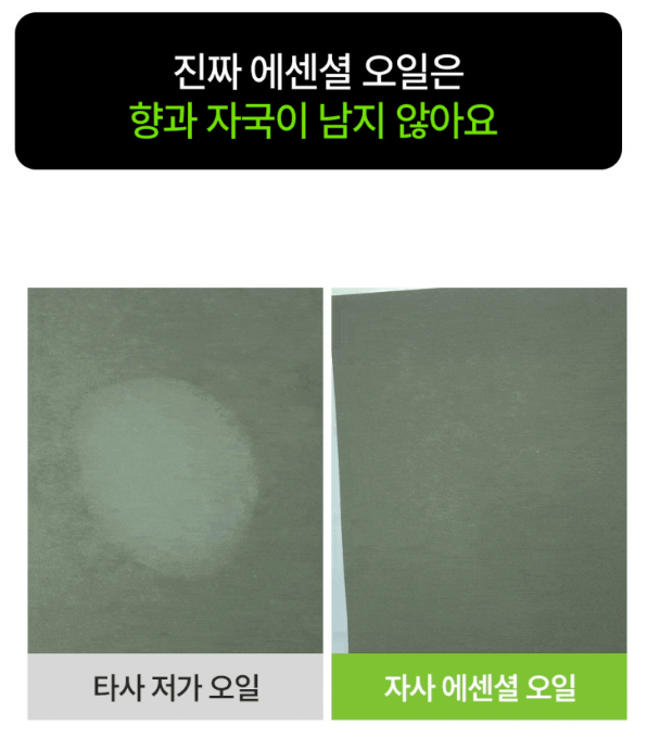👉 팁:종이에 오일 한 방울 떨어뜨려보세요. 24시간 후 자국이 남지 않는다면 진짜 에센셜 오일입니다.